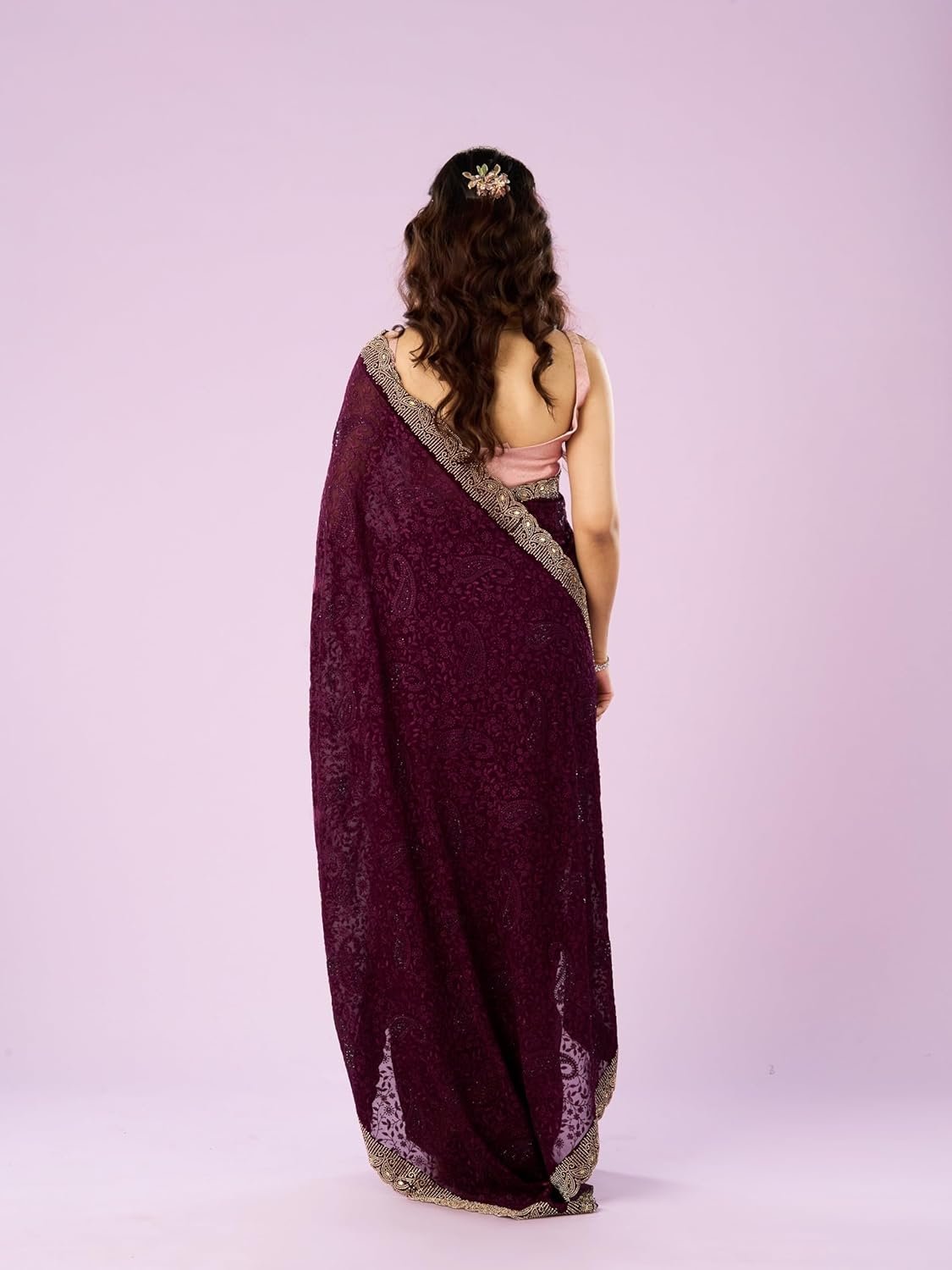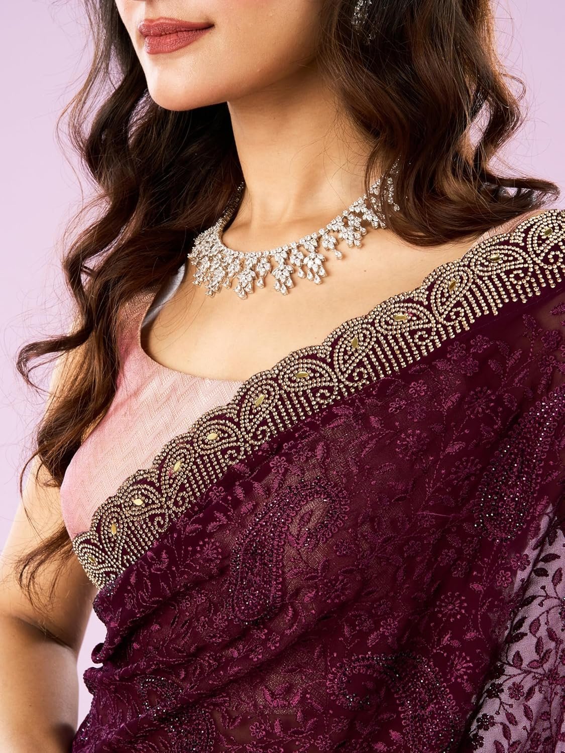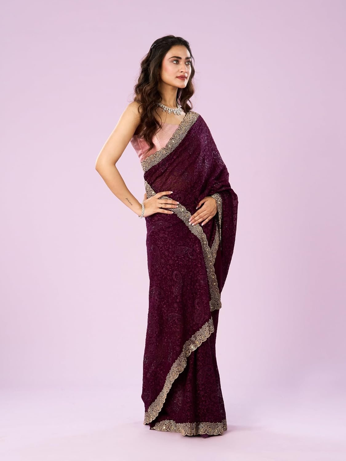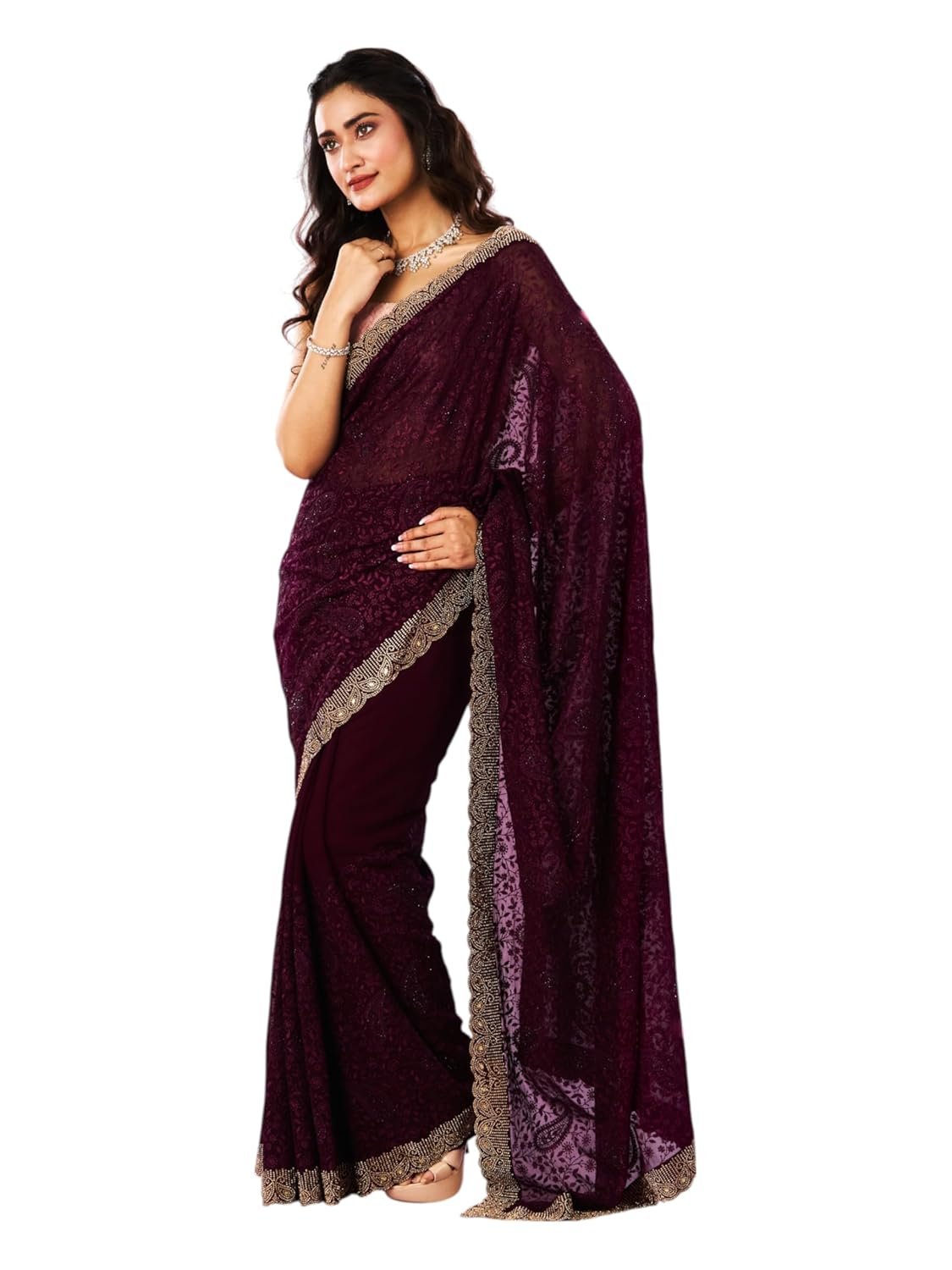 - Design:-Elevate your festive wardrobe with our serene wine Georgette saree. It promises an extraordinary elegance that’s undeniably charming. This lovely drape is accompanied by an unstitched blouse fabric. allowing you to tailor it for a suitably customized fit. Perfect for any celebration.